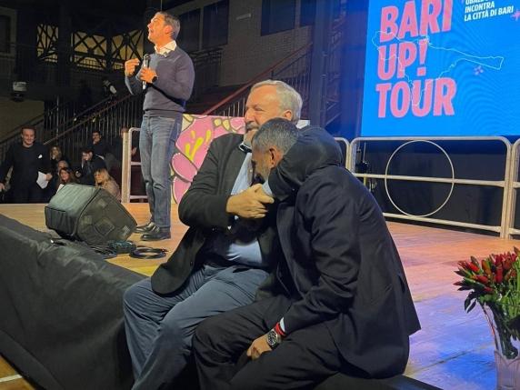 Decaro è arrivato quando la manifestazione era iniziata e, non trovando posto in platea, si è seduto sul palco. Emiliano allora si è avvicinato, si è seduto vicino a lui e lo ha abbracciato mentre dal pubblico si è sollevato un caloroso applauso. A presentare Decaro sul palco è stato poi proprio Emiliano.