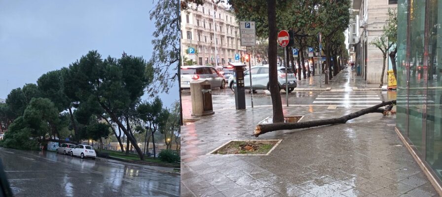 Allerta arancione su tutta la Puglia dalla mezzanotte di oggi, 4 dicembre, per rischio idrogeologico e per temporali. La prefettura di Bari ha invitato i sindaci alla massima attenzione. Si segnalano i crolli di un albero a Poggiofranco in viale Papa Pio XII, di uno in corso Cavour (angolo via Putignani), di uno al San Paolo e di uno a San Pasquale. Ombrelloni e dehors volati via sul lungomare. Strade allagate in tutta la città e in provincia.