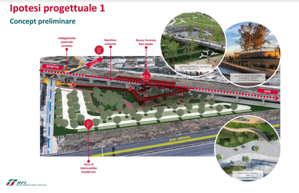 – “l’ipotesi 1”, ubicata lungo strada Torre Tresca subito dopo il sottopasso della SS16 tangenziale di Bari, il cui costo stimato risulterebbe sostenibile da RFI con fondi attualmente disponibili e per la quale alcune delle opere necessarie sono già realizzate da tempo;