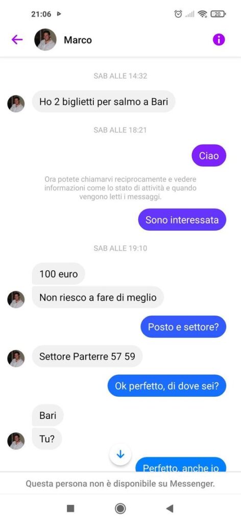“Vi scriviamo perché c’è un ragazzo che dice di essere di Bari, che sta truffando dal 2020 un’infinità di persone. Le autorità sanno tutto, ma accumulano denunce senza fare nulla”. La denuncia è di Valerio e Chiara, due giovani ragazzi che hanno cercato su Facebook di acquistare due biglietti per il concerto di Salmo in programma il 2 dicembre al Palaflorio di Bari, evento da tempo sold out.