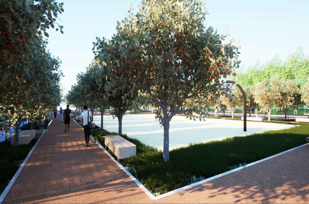 L’arrivo al parco si realizza mediante due aree di accoglienza diametralmente opposte: una all’arrivo del sottopasso dalla spiaggia, spazio individuato in corrispondenza della rotatoria, e un’altra all’ingresso del parco da via Gentile. Entrambe le aree saranno attrezzate con giochi per bambini, tavoli da picnic, tavoli da scacchi e aree di sosta e giardini di prossimità. Il progetto prevede il recupero e il miglioramento degli impianti sportivi esistenti (campi da calcio e pista atletica, non oggetto del presente appalto) e la realizzazione di nuove aree dedicate allo sport. Una di queste sarà dotata di campi da gioco (tennis, padel, pallavolo/basket e beach volley), l’altra, immersa in un parco verde proprio a simulare percorsi sotto il bosco, avrà aree attrezzate per lo skate, bici da cross e circuito salute. Una delle premesse principali dell’intervento è consentire la vista mare fin dall’ingresso del parco. Le zone alberate manterranno il sottobosco sgombro da arbusti che potrebbero ostacolare la visuale incorniciando l’orizzonte del mare tra il piano terra e le cime degli alberi. Per la selezione delle specie vegetali si è tenuto conto della loro diversità, dell’adattamento al clima mediterraneo e, soprattutto, delle particolarità della loro ubicazione puntando su un’importante piantagione di specie autoctone mediterranee, ben adattate, con garanzia di uno sviluppo corretto e sano, con poco consumo di acqua e poca manutenzione. Per poter orientare il progetto verso un futuro sostenibile e raggiungere un auspicabile grado di autosufficienza, il progetto mira a ottimizzare le risorse sviluppando soluzioni costruttive razionali e semplici.