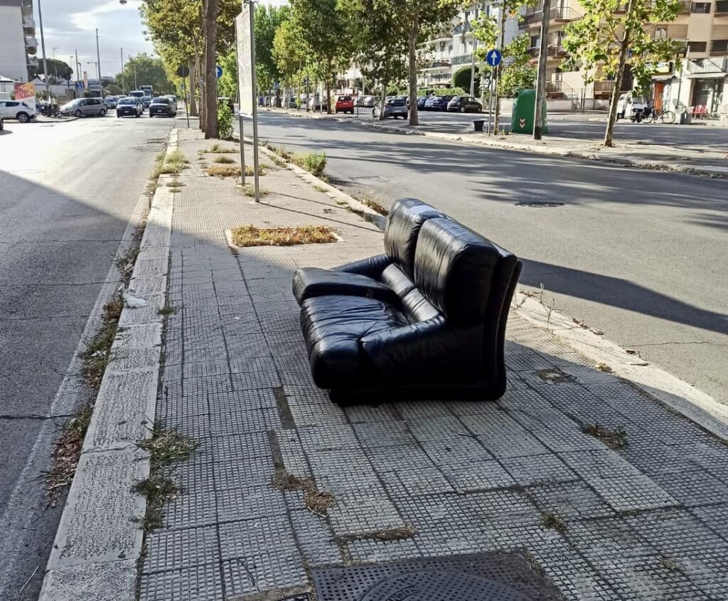Un divano abbandonato nel bel mezzo dello spartitraffico in via Peucetia, nel quartiere Japigia di Bari. A denunciarlo sui social è Lorenzo Leonetti, presidente del primo municipio di Bari. “Questo non vuole essere il solito sfogatoio su inciviltà e degrado ma una riflessione che faccio ad alta voce con i cittadini baresi. Un divano abbandonato vicino ad un’area eco senza prenotazione, ci può stare, ne vediamo tanti. Amiu che impiega più giorni per ritirare un ingombrante possiamo accettarlo, ritirando tonnellate di rifiuti al giorno di potrebbero generare ritardi – le sue parole -. Ma in questo caso, vorrei capire, cosa circola nella testa di una persona che si prende l’impegno di portare il divano fuori da casa propria, trasportarlo su uno spartitraffico in uno degli incroci più trafficati della città lontano dalle aree ecologiche del quartiere consapevole di aver fatto uno sforzo fisico maggiore rispetto a quello previsto se avesse utilizzato il metodo di conferimento ingombranti previsto da Amiu cosciente che l’incrocio è video sorvegliato. Aiutatemi a capire! Mi piacerebbe leggere la vostra considerazione sull’argomento e nel frattempo prendiamola a ridere, nei commenti dedichiamo una parola a questi esperti di urbanistica tattica. Nel frattempo Amiu Puglia provvederà a fare il suo dovere”.