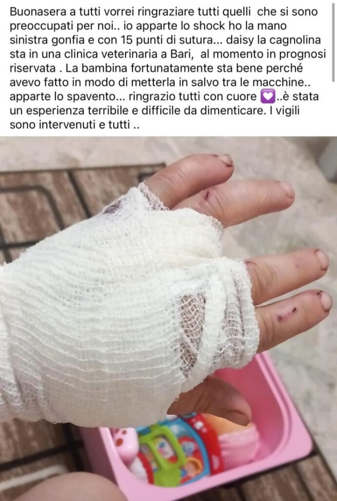 Attimi di terrore ieri a Palese dove mamma e figlia, insieme alla loro cagnolina, sono state aggredite da due pitbull sfuggiti al controllo del proprietario. La donna, nel tentativo di salvare la sua bimba di 2 anni e mezzo e il cane, è stata ferita ad una mano ed è stata trasportata in ospedale dove sono stati applicati 15 punti di sutura. Il cagnolino, ferito, è stato successivamente recuperato e portato dal veterinario.