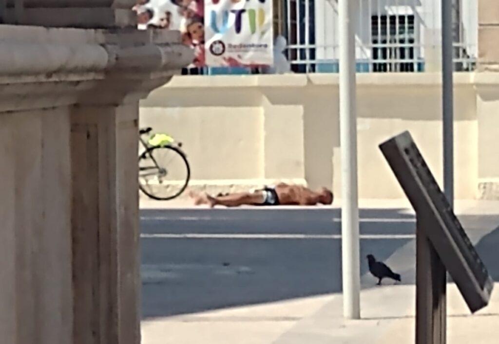 Bari, lascia la bici e si stende sul marciapiede a prendere il sole: abbronzatura alternativa in piazza Redentore