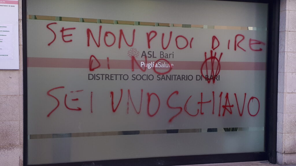 “Se non puoi dire di no sei uno schiavo”, “Green Pass Nazi” e “Il vaccino uccide il governo lo sa e mente”: le scritte riportano frasi appartenenti ai movimenti NoVax e No Green Pass. Tutto questo non ha fermato i dipendenti del Cup che da questa mattina hanno svolto tranquillamente il loro servizio all’interno della struttura.