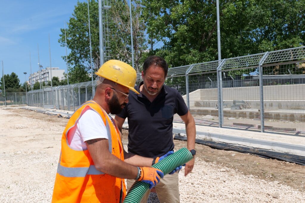 “Sono qui per verificare l’andamento dei lavori che stimiamo di ultimare entro fine settembre, in modo da consegnare l’impianto alle società e alle squadre sportive in tempo utile per la prossima stagione – commenta Pietro Petruzzelli -. È stata infatti ultimata la sistemazione della zona destinata al pubblico: in particolare, nelle ultime settimane, è stata posizionata la recinzione di separazione tra pubblico e il campo da gioco – necessaria per ottemperare alle prescrizioni per l’omologazione del campo alle categorie superiori -, sono stati installati i box prefabbricati che ospiteranno la biglietteria e i servizi igienici per il pubblico ed è in va di completamento la pavimentazione della zona riservata al pubblico. Inoltre, sono state fissate le quattro torri faro da 20 metri l’una che illumineranno il campo, mentre da questa settimana sono partiti anche i lavori di preparazione del sottofondo del campo da gioco con il posizionamento l’impianto di drenaggio: al termine della preparazione verrà posato il manto erboso. Contestualmente i lavori procederanno sugli spogliatoi, che sono stati già ampliati e saranno oggetto di riqualificazione”.