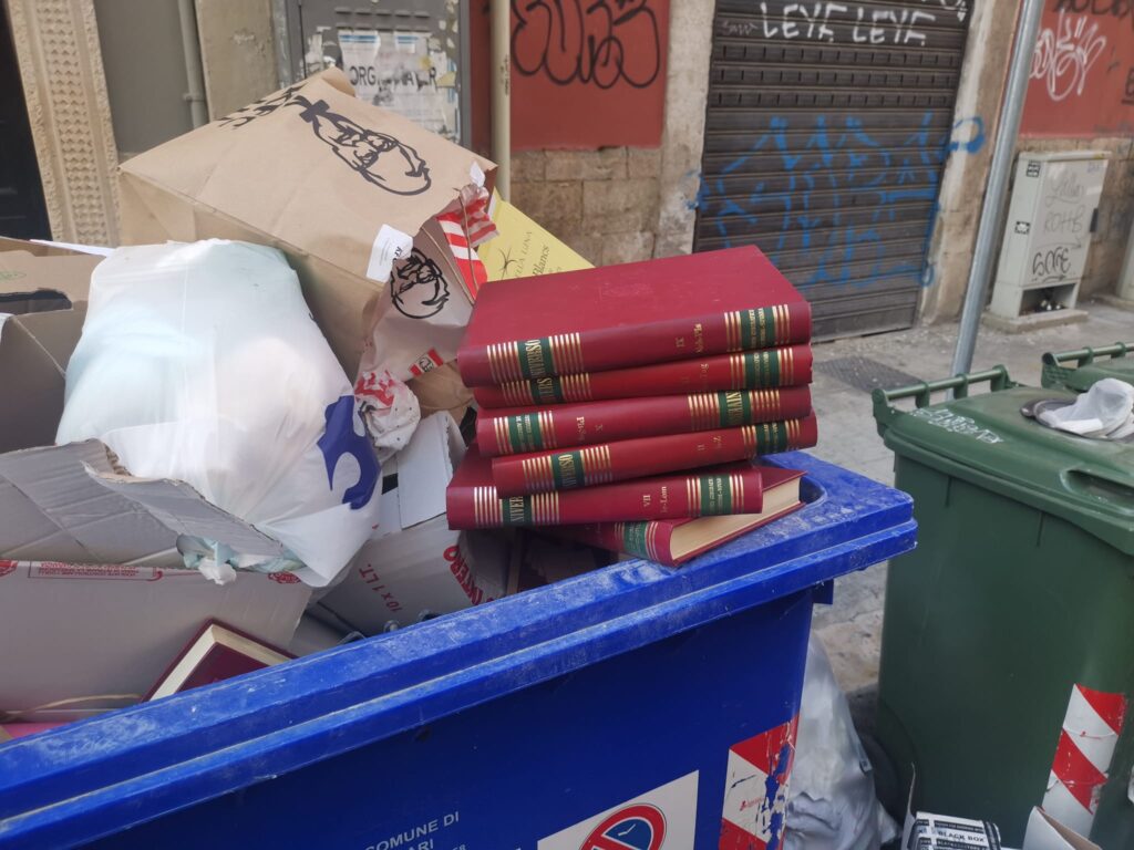 Dodici volumi dell’enciclopedia Universo abbandonati nel cassonetto della carta in via Piccinni ad angolo con via Sparano. Uno “spreco” di cultura denunciato ieri sui social da Donato Cippone, del Coordinamento regionale di Cittadini, Associazioni e Comitati territoriali per la salvaguardia dell’ambiente e del clima, e per la tutela dei territori in Puglia. “Volumi recuperati dal cassonetto e ripuliti. Se ritenete fate passaparola e chiunque è interessato a questa completa enciclopedia mi contatti pure”, l’appello di Cippone. In un’era in cui i social e il web hanno preso il sopravvento sul cartaceo, resta il mistero su chi abbia abbandonato tutti questi volumi in pieno centro.