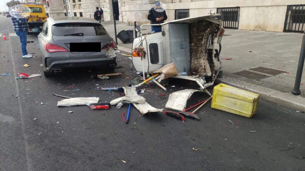 Brutto incidente alle prime luci dell’alba sul lungomare di Bari. Nei pressi del comando dei Carabinieri, stando a quanto siamo riusciti ad apprendere, una Lancia Y pare abbia tamponato violentemente l’Apecar del netturbino dell’Amiu mentre era ferma al semaforo. Il tre ruote, a causa della spinta, ha poi sbattuto contro una Mercedes, finendo poi per ribaltarsi.