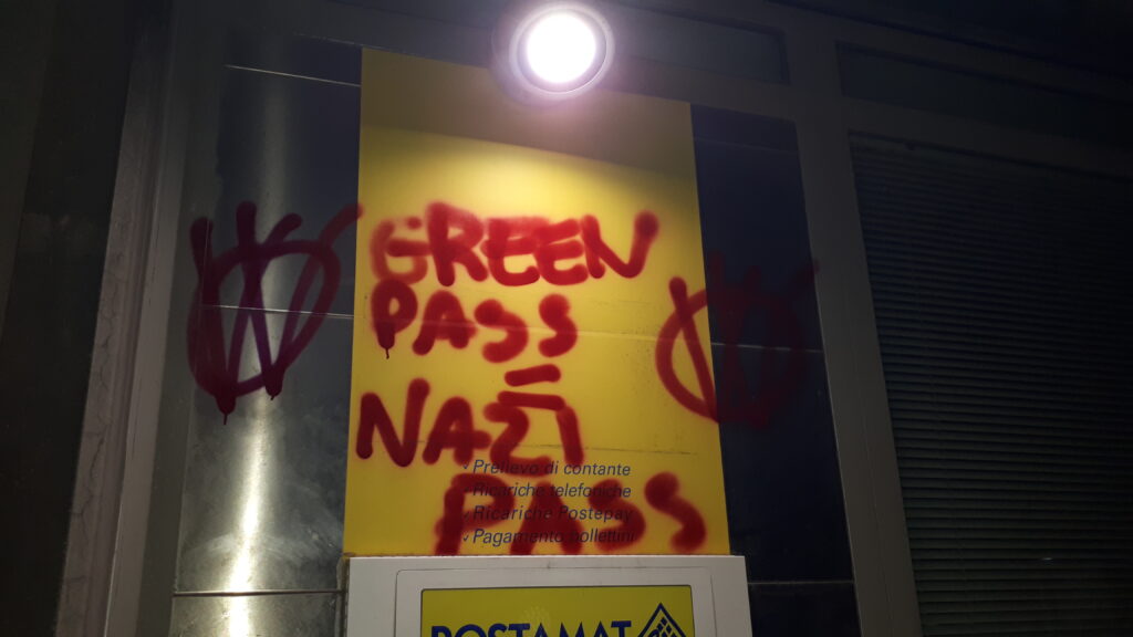 Non si esclude possa essersi trattato di qualcuno che non ha ben gradito le restrizioni ancora attive negli uffici pubblici, decidendo così di esprimere il proprio disprezzo con la scritta “Green pass – Nazi pass”.