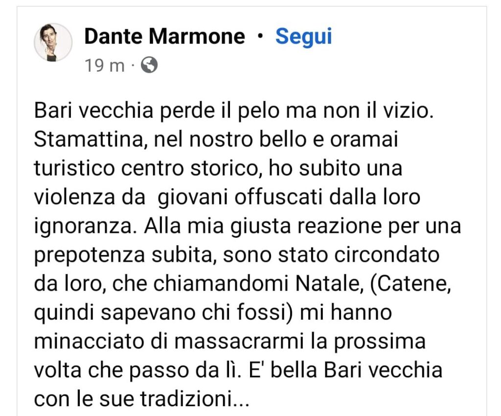 Bari vecchia perde il pelo ma non il vizio. Stamattina, nel nostro bello e oramai turistico centro storico, ho subito una violenza da giovani offuscati dalla loro ignoranza. Alla mia giusta reazione per una prepotenza subita, sono stato circondato da loro, che chiamandomi Natale, (Catene, quindi sapevano chi fossi), mi hanno minacciato di massacrarmi la prossima volta che passo da lì. È bella Bari vecchia con le sue tradizioni…”. A scrivere sul suo profilo Facebook l’attore barese Dante Marmone, non certo un comune cittadino barese, uno di quelli che subisce angherie quotidiane da un manipolo di “banditi”, convinti di essere i padroni di del borgo antico. Il post ha fatto preso il giro della città, causando non pochi imbarazzi oltre che lo sdegno dei baresi perbene. L’attore era in sella alla sua bici su Strada Palazzo di Città , quando un ragazzo lo ha quasi investito col tradizionale “biciclettone” da “qui comando io”.