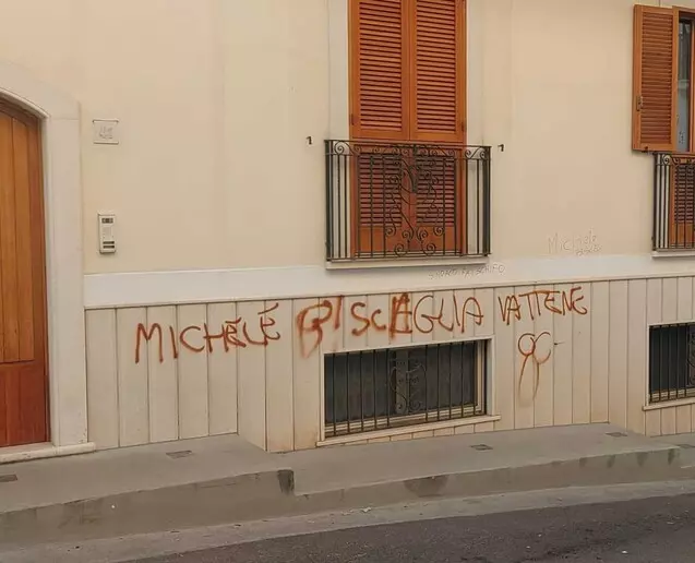 “Michele Bisceglia vattene”. È la scritta, realizzata con vernice rossa, comparsa questa mattina sul muro di casa della madre del primo cittadino di Mattinata (Foggia), Michele Bisceglia, sindaco del comune garganico dal settembre 2020.