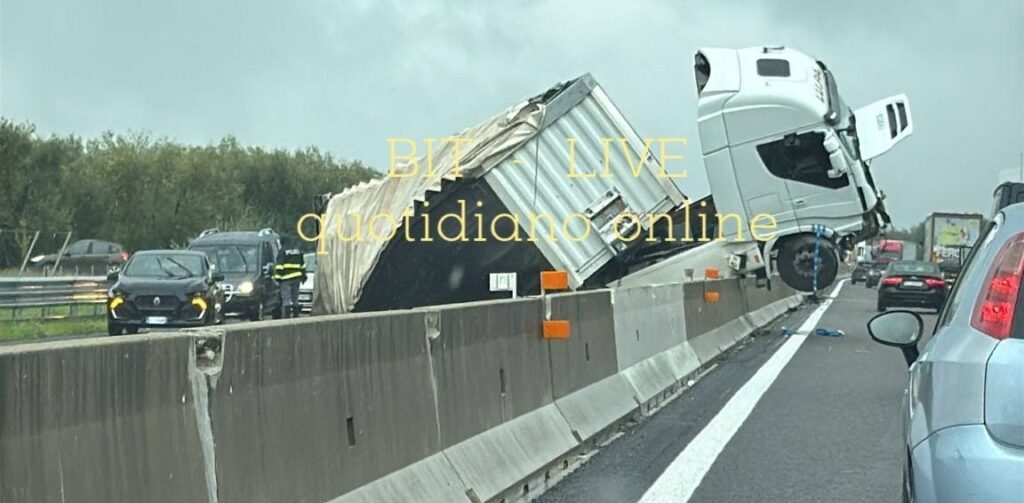 A causa delle forti precipitazioni, un mezzo pesante è uscito improvvisamente di strada per motivi ancora in corso di accertamento, ribaltandosi e rimanendo in bilico sullo spartitraffico tra le due carreggiate.