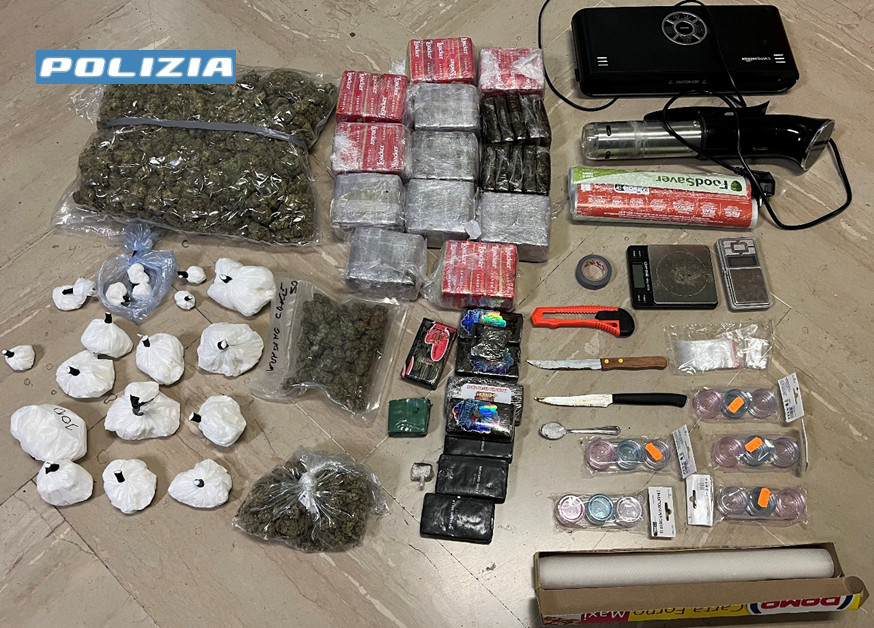 Nell’ambito di una perquisizione domiciliare effettuata dai “Falchi” della sezione Contrasto al Crimine Diffuso della Squadra Mobile della Questura di Bari, presso l’abitazione in uso ai due giovani, sono stati rinvenuti e sequestrati 805 gr. di cocaina, 7,5 Kg. di hashish, 949 gr. di marijuana e materiale utilizzato per il confezionamento delle dosi.