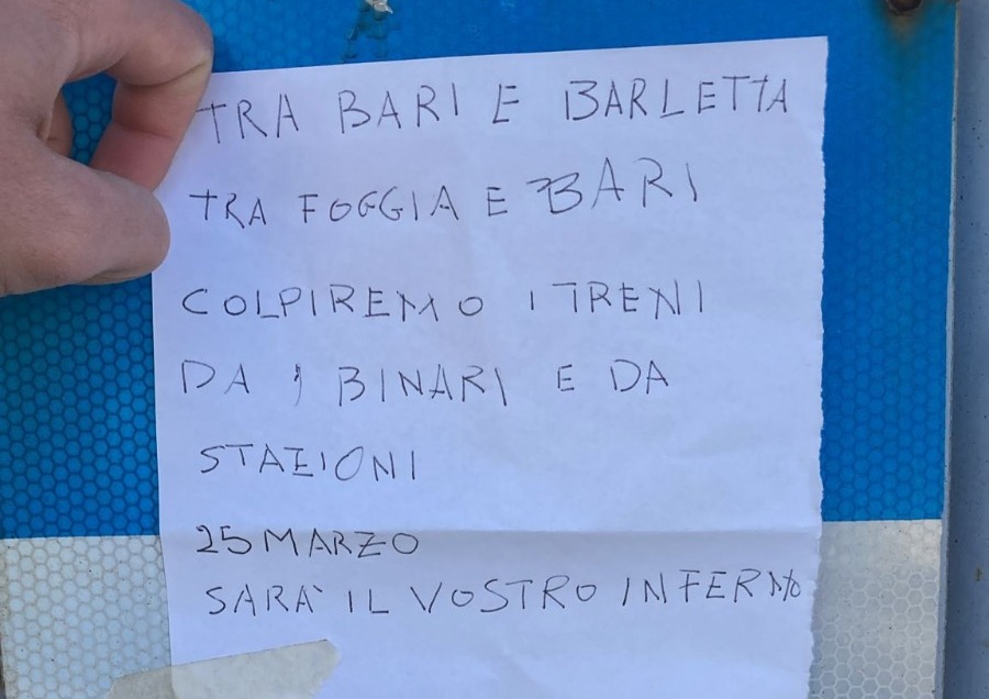 “Tra Bari e Barletta, tra Foggia e Bari colpiremo i treni da binari e stazioni: sarà il vostro inferno”. Questo è il contenuto di un altro messaggio trovato nella stazione di Trani. La circolazione ferroviaria tra Pescara e Bari è attualmente sospesa a causa dell’allarme bomba registrato alla stazione di Trani dove sono in corso le attività di verifica da parte di carabinieri, artificieri della polizia e agenti della polizia ferroviaria.