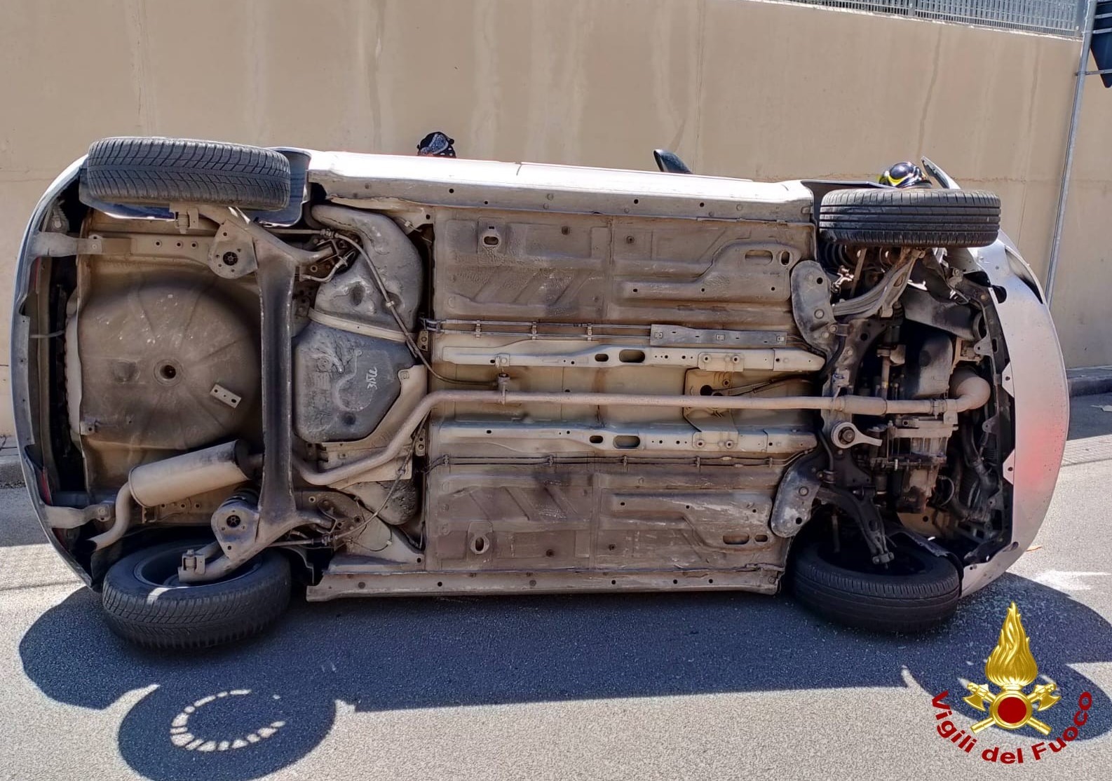 Alcuni passanti, aiutati dai soccorritori del 118, hanno estratto la donna che per fortuna è rimasta solo contusa ma in buone condizioni di salute. In un oretta di lavoro i Vigili hanno poi messo in sicurezza i luoghi e l’auto ribaltata.