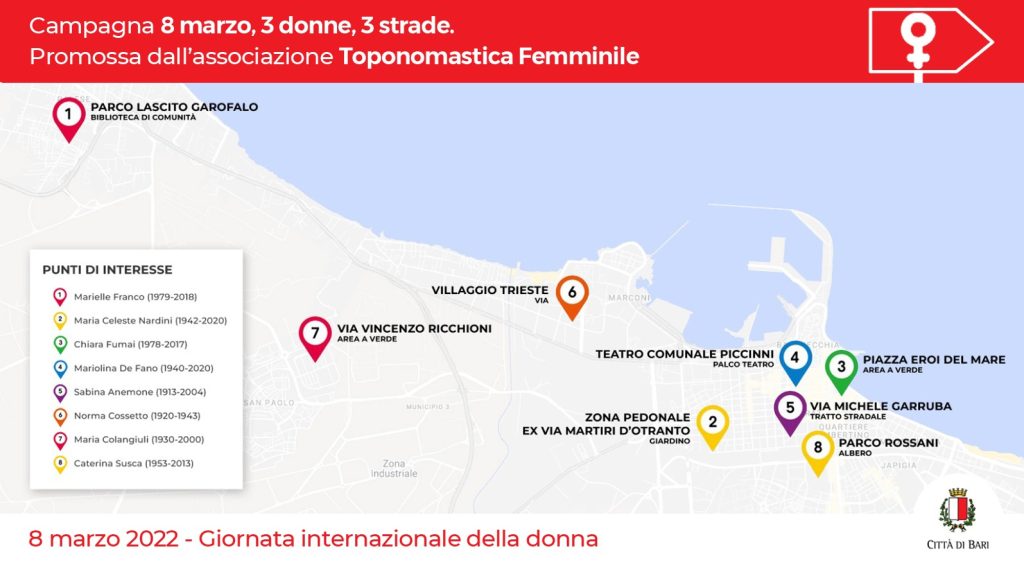 L’amministrazione comunale, aderendo alla campagna di ANCI e dell’associazione Toponomastica femminile “8 marzo, 3 donne, 3 strade”, finalizzata a sanare il gap di genere nella toponomastica, intende rendere omaggio a otto donne che hanno rappresentato, ciascuna per la sua storia, modelli di impegno politico e civile, eccellenze nel campo dell’arte e della cultura e vittime della violenza di genere e criminale.