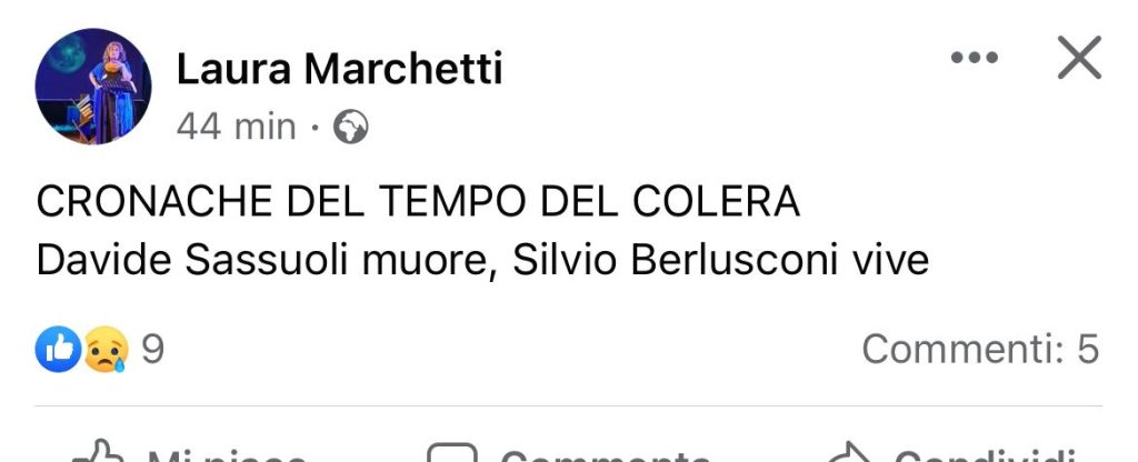 “Cronache del tempo del colera. Davide Sassuoli muore, Silvio Berlusconi vive”. È il post pubblicato su Facebook (con tanto di cognome sbagliato del presidente del Parlamento europeo scomparso quest’oggi), e poi rimosso dopo alcuni minuti, dalla professoressa gravinese, Laura Marchetti, inserita nella lista dei 45 membri del collegio degli esperti della Regione Puglia dal governatore Michele Emiliano.