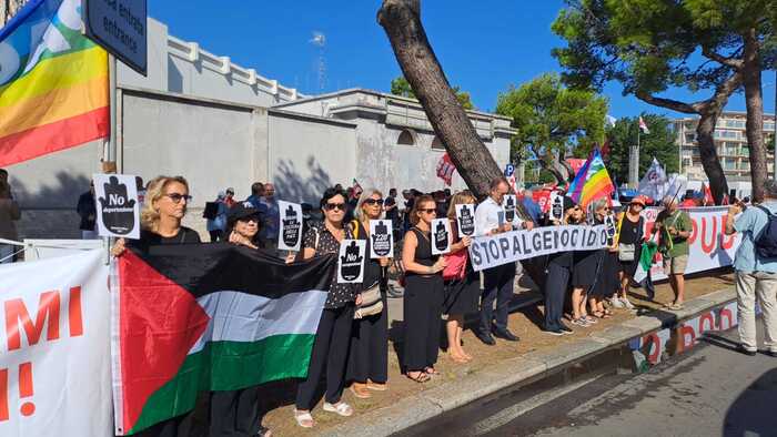 Bandiere della pace e della Palestina, e poi cartelloni in cui si invita il ministro degli Esteri e vicepremier, Antonio Tajani, a “chiudere il consolato israeliano a Bari”, questa mattina nel presidio organizzato dal ‘Comitato per la pace’ a Bari all’esterno della Fiera del Levante, dove tra pochi minuti inizierà la cerimonia d’inaugurazione della 88esima edizione della Campionaria.