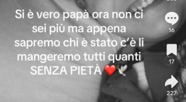 “Si è vero papà, ora non ci sei più ma appena sapremo chi è stato ce li mangeremo tutti quanti senza pietà”, il testo pubblicato su TikTok poi rimosso prontamente questa mattina dopo le polemiche. “Papà ti hanno portato via da me finiscamente… Ma so che con la tua anima mi proteggerai sempre… non lasciarmi mai… ti dedicherò ogni mio traguardo ti amo infinitamente”, il nuovo messaggio pubblicato.
