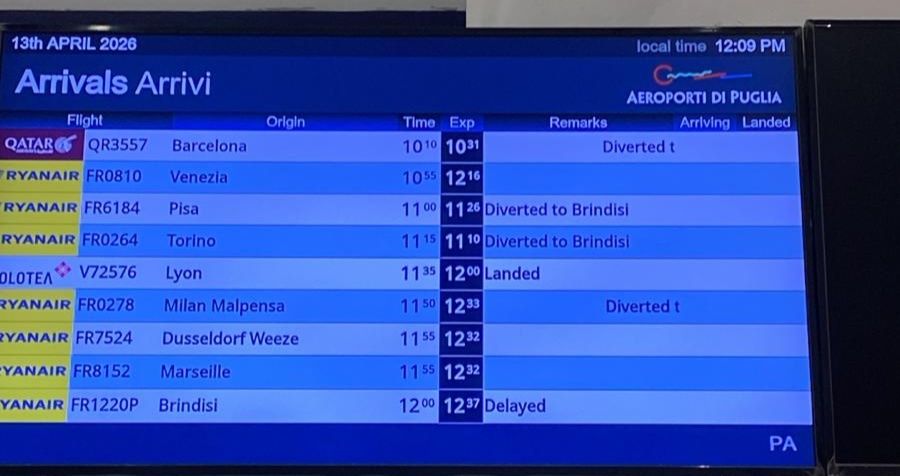 Nella mattinata odierna, quattro voli diretti all’aeroporto di Bari sono stati dirottati verso lo scalo di Brindisi per ragioni di sicurezza. Si tratta di collegamenti in arrivo da Siviglia, Barcellona, Pisa e Torino.