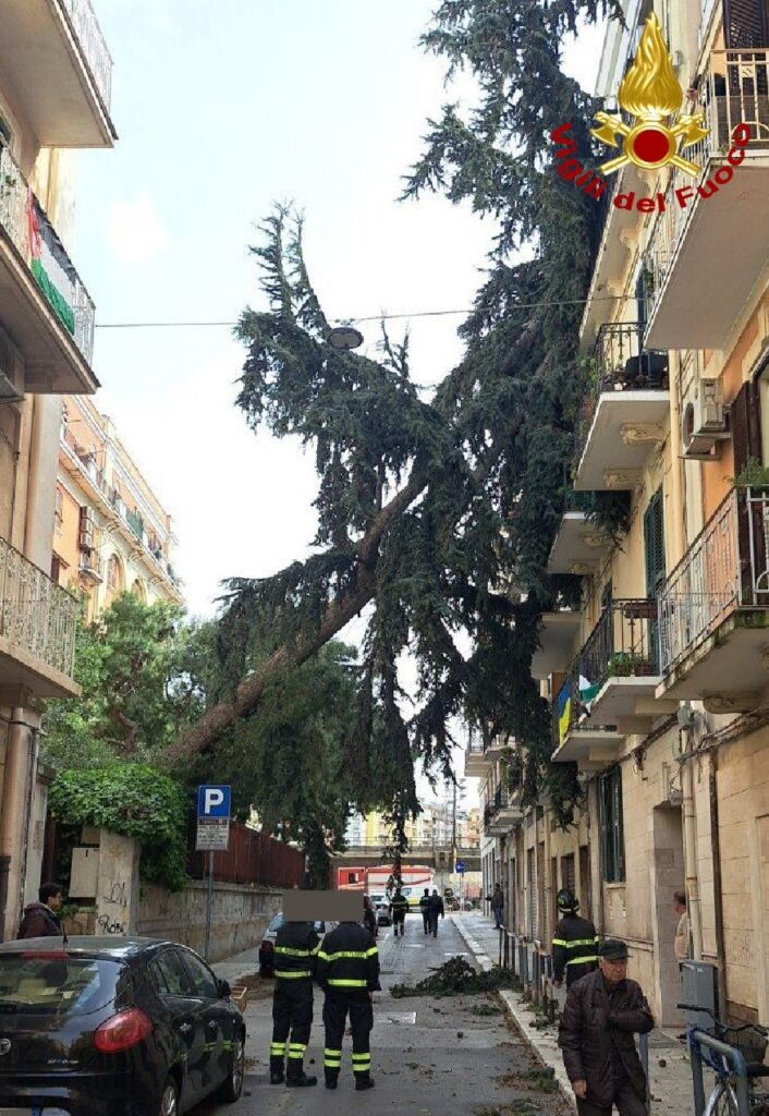 Una ringhiera di un balcone pericolante è stata prontamente rimossa da un quinto piano grazie all’ausilio dell’autoscala ed è in fase di rimozione un abete di oltre 20 metri caduto sulla palazzina accanto. Non si segnalano fortunatamente a Bari fino a questo momento danni a persone.