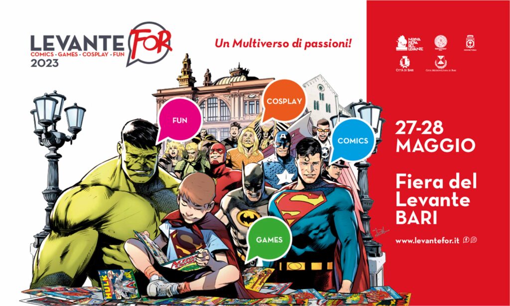 Fine settimana all’insegna della creatività . Si inaugura sabato 27 maggio la prima edizione di Levante For, la manifestazione di settore dedicata al mondo nerd organizzata da Nuova Fiera del Levante a Bari, in programma dal 27 al 28 maggio per appassionati di fumetti, games, cosplay. All’inaugurazione alle 9.30 all’interno del Nuovo Padiglione della Fiera del Levante parteciperanno la consigliera della Nuova Fiera del Levante, Marina Lalli, gli assessori alla allo Sviluppo Economico, alla Cultura, alle Politiche giovanili, all’Ambiente e allo Sport del Comune di Bari, rispettivamente Carla Palone, Ines Pierucci, Paola Romano, Pietro Petruzzelli, e la consigliera delegata alle Politiche Culturali della Regione Puglia, Grazia Di Bari. Alle 10.00 si apriranno le porte al pubblico. Due giorni incentrati sulla cultura pop con l’obiettivo di ridare a Bari e alla Puglia una posizione di spicco nel panorama degli eventi di settore. Il programma dell’evento sarà ricco di incontri, attività e conferenze e si dividerà in vari palchi che avranno una programmazione dettagliata durante le due giornate. Ci saranno un’Area Palco, un’Area Meet&Greet, un’Area Japan e ben tre diverse Aree Talk.