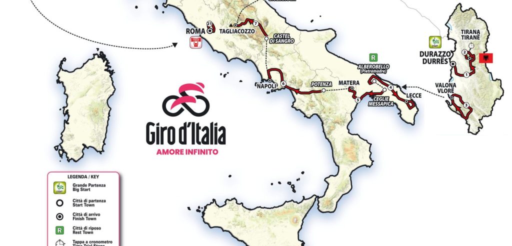 Ventuno tappe per 3.413 km da Durazzo, in Albania, fino ad arrivare a Roma per il gran finale. E’ stato svelato all’Auditorium Parco della Musica il tracciato della 108ma edizione del Giro d’Italia, che prenderà il via il prossimo 9 maggio per concludersi nella Capitale il 1 giugno. Due le crono, sei le tappe per velocisti, otto di media montagna e cinque di alta montagna. Circa trentotto, invece, i chilometri di sterrato, trenta di strade bianche nel finale della tappa di Siena e otto sul Colle delle Finestre che per la terza volta nella sua storia sarà anche La ‘Cima Coppi’ con i suoi 2.178 metri (penultima tappa). La Montagna Pantani sarà il Passo del Mortirolo, mentre la ‘Tappa Bartali’ sarà la Gubbio-Siena con arrivo in Piazza del Campo.