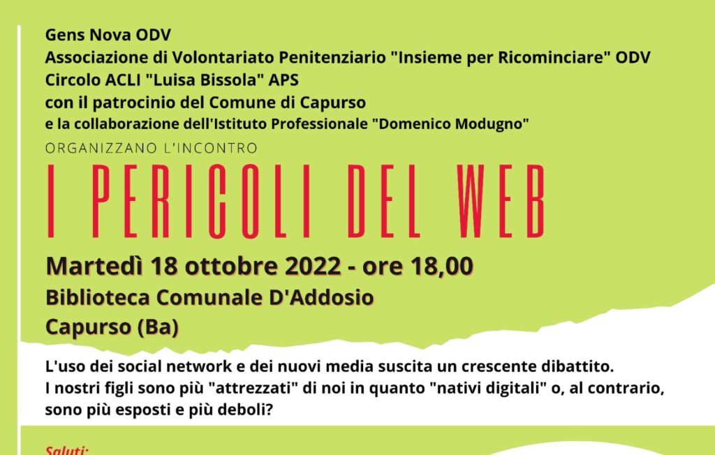 Gens Nova, l’associazione di volontariato penitenziario “Insieme per ricominciare” e il circolo ACLI “Luisa Bissola” APS con il patrocinio del Comune di Capurso e la collaborazione dell’Istituto Professionale “Domenico Modugno” hanno organizzato per domani, martedì 18 ottobre, l’incontro “I pericoli del web” che si terrà nella biblioteca comunale D’Addosio di Capurso alle ore 18. “L’uso dei social network e dei nuovi media suscita un crescente dibattito. I nostri figli sono più attrezzati di noi in quanto nativi digitali o sono più esposti e più deboli?”, è il quesito sul quale verte l’incontro a cui prenderanno parte il sindaco di Capurso, Michele Laricchia, l’assessore al Welfare del Comune di Capurso, Mariella Romano, l’avvocato Antonio Maria La Scala, presidente di Gens Nova, la dott.ssa Francesca Bottalico, assessore al Welfare del Comune di Bari, la dott.ssa Maria De Tommaso, dirigente gruppo ascolto “Sportello Gens Nova” e l’avv. Laura Bellanova, coordinatrice equipe di sostegno Gens Nova.