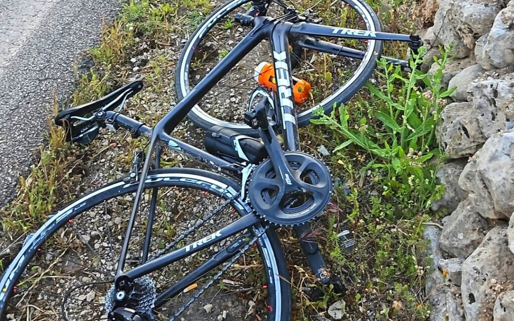 Il fatto è avvenuto questa mattina a Cassano, protagonista una donna. Nessuna conseguenza grave per il ciclista, anche se la bici si è distrutta e il casco si è ammaccato dopo lo schianto contro un muretto a secco. Travolta anche la moglie che precedeva di poco.