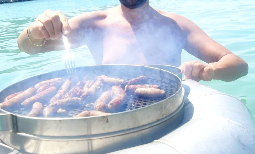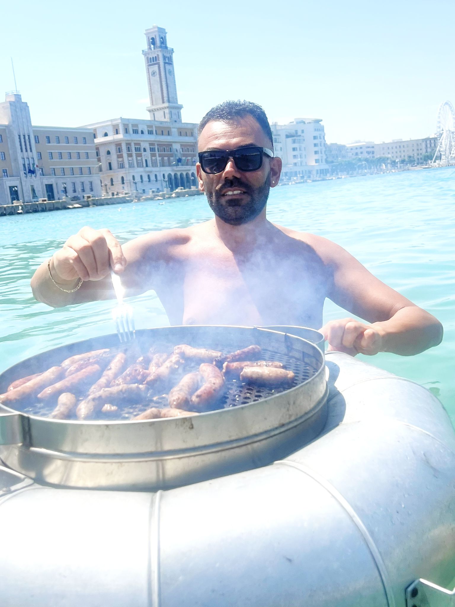 “La brace accesa” in mare. L’ultima invenzione arriva direttamente dal lungomare di Bari. Vittorio ha pensato di attrezzarsi e creare una griglia galleggiante per arrostire salsiccia e carne sulla falsa riga di quanto accaduto a Taranto dove, nei giorni scorsi, un gruppo di giovani aveva ideato una zattera improvvisata come piattaforma galleggiante per il barbecue. La foto è poi diventata virale sul web.