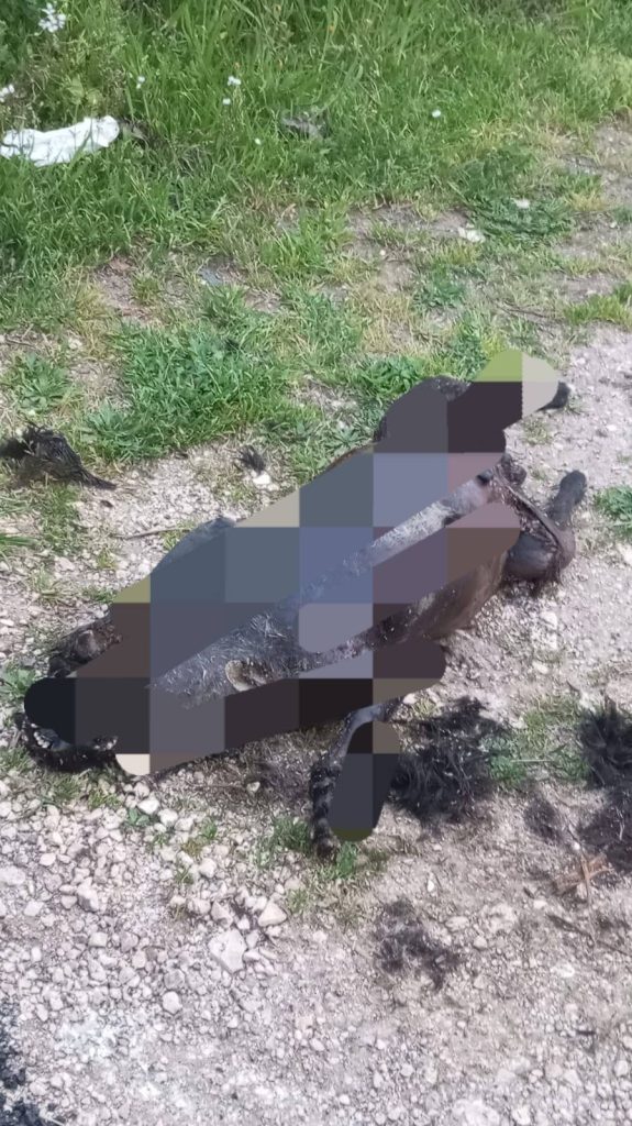 “Nelle campagne ci sono tanti cani liberi sul territorio ai quali anche la gente compassionevole dà loro del cibo. Purtroppo non tutti hanno sentimenti positivi nei confronti degli animali. Ci hanno segnalato un povero cane deceduto, con parte del corpo carbonizzato. Sembrerebbe trattarsi di un simil pitbull di colore scuro, ovviamente privo di microchip”.
