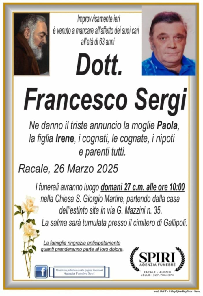 Il professionista era conosciuto a Racale e Melissano ed era molto amato anche per il suo impegno attivo nel mondo del volontariato. I funerali si sono svolti questa mattina.