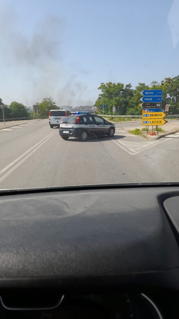 Sterpaglie in fiamme nella zona industriale di Bari-Modugno, nelle aree antistanti la Bridgestone e la Chimica D’Agostino. Nel cielo si è alzata una colonna di fumo nero.