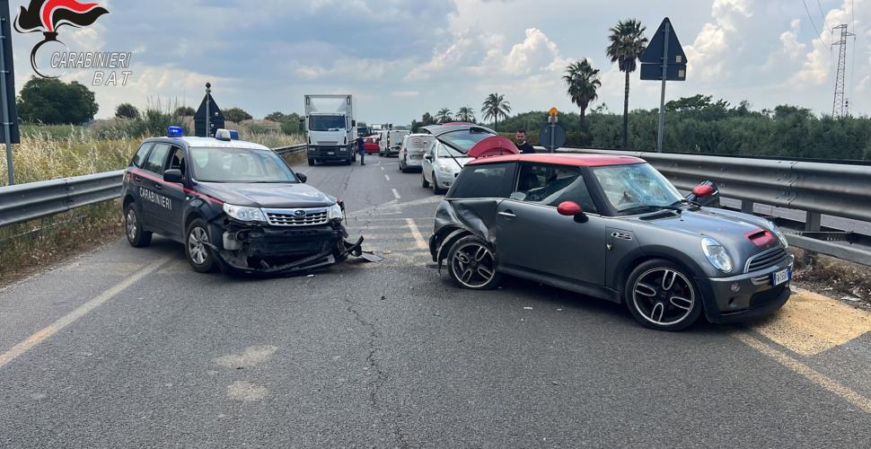 Non si ferma all’alt dei Carabinieri e provoca incidente con un’altra pattuglia. Lo scontro è avvenuto ieri pomeriggio sulla sp231, nella Bat. I carabinieri durante il posto di controllo hanno notato in una Mini Cooper un pregiudicato di Canosa. L’uomo, anziché fermarsi all’alt, ha continuato la sua corsa. Stando a quanto appreso l’uomo avrebbe frenato bruscamente facendosi travolgere da un’altra pattuglia che lo stava inseguendo.