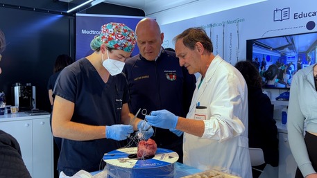Nel track della Medtronic, all’interno del Policlinico, in mattinata è stato realizzato un wet-lab, un programma di training per procedure chirurgiche attraverso l’utilizzo di cuori di maiale e di un manichino di simulazione. Gli specializzandi hanno potuto così simulare l’impianto della valvola aortica ed effettuare una riparazione valvolare con simulatori ad alta fedeltà. Nel pomeriggio gli specialisti simuleranno invece interventi di sostituzione valvolare, riparazione chirurgica mitralica e tricuspidale, canulazione Ecmo, ablazione chirurgica con radiofrequenza e anastomosi coronarica. Con l’ausilio della realtà virtuale sarà infine provato l’impiego del sistema di autotrasfusione autoLog Iq utilizzato per raccogliere, filtrare e ri-infondere il sangue del paziente durante un intervento chirurgico.