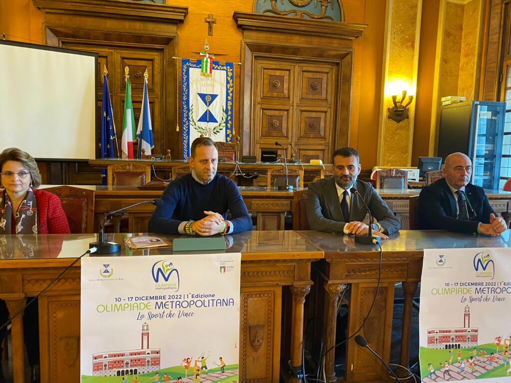 Promossa dalla Città Metropolitana di Bari, con il patrocinio del Coni regionale, la prima edizione della manifestazione nasce nell’ottica di promozione e valorizzazione delle attività sportive e ricreative, tese a favorire valori come inclusione sociale, appartenenza al territorio, salute, benessere psicofisico e aggregazione. L’ Olimpiade Metropolitana coinvolgerà dal 10 al 17 dicembre i comuni di Adelfia, Altamura, Bari, Capurso, Casamassima, Cassano delle Murge, Cellamare, Corato, Gravina in Puglia, Locorotondo, Modugno, Mola di Bari, Monopoli, Noicattaro, Palo del Colle, Sammichele di Bari, Sannicandro di Bari, Terlizzi, Triggiano, Turi che hanno messo a disposizione le proprie strutture sportive.