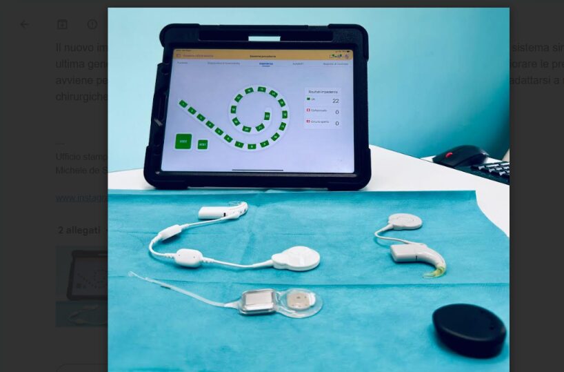 Un nuovissimo impianto cocleare smart, dotato memoria interna per permettere una gestione avanzata del software. L’apparecchio acustico è stato impianto al Policlinico di Bari su un bambino di 11 anni dall’equipe del professor Nicola Quaranta, direttore dell’unità operativa di Otorinolaringoiatria.