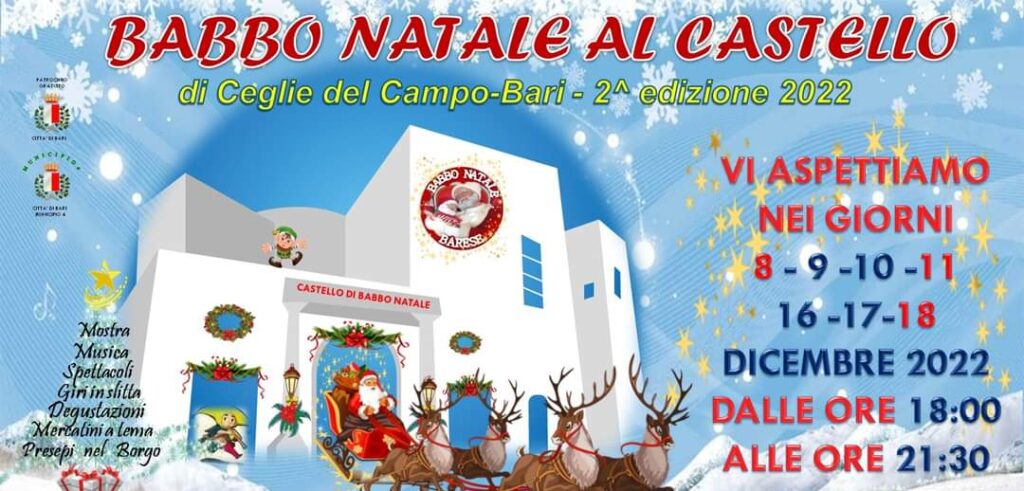 Dall’8 all’11 dicembre e dal 16 al 18 dicembre si terrà l’evento “Babbo Natale al Castello” a Ceglie del Campo organizzato dalla cooperativa Sociale NODISS Onlus e dal Comitato Feste Patronali Maria SS. di Buterrito. L’appuntamento è al castello di Ceglie, nell’ala del salone della cooperativa Nodiss, dalle ore 18 alle 21.30. Con la collaborazione delle sei contrade (Aia di Cristo vincitrice ultimo palio, Sant’Angelo, La Fitta, Piscine, Buterrito e Portanuova) verranno allestiti 6 presepi nel borgo medievale e programmate varie attività per grandi e piccoli in collaborazione con Kailia che ospiterà vari eventi, tra cui lo spettacolo di Emanuele Tartanone del MUDU e la tombolata per i più grandi con premi donati da attività commerciali locali. L’Associazione CO.VO.CI.ATT (COORDINAMENTO VOLONTARI CITTADINI ATTIVI) si occuperà di abbellire il borgo medievale con luci che faranno respirare l’aria natalizia nel paese. L’angolo gastronomico sarà invece organizzato da laici Giuseppini, dalla confraternita San Giuseppe e dalla confraternita Maria SS. Di buteritto per l’angolo gastronomico. L’evento è gratuito, le offerte che verranno raccolte saranno date in beneficenza per la raccolta fondi del Progetto “PET TERAPY” rivolto ai Bimbi ricoverati nel Reparto di Oncologia Pediatrica del Policlinico di Bari con la collaborazione dell’Ass. del BABBO NATALE BARESE.