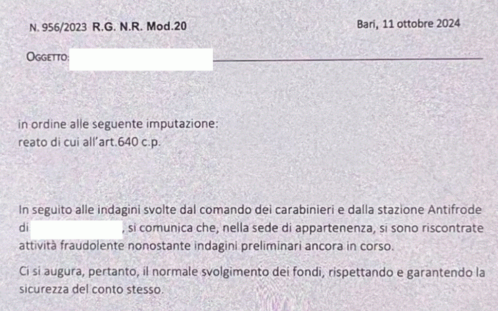 Nella mattina dello scorso venerdì 11 ottobre, una donna di Putignano, 63 enne, ha ricevuto una telefonata sulla propria utenza mobile da parte di un anonimo interlocutore che, dopo essersi qualificato come “Maresciallo dei Carabinieri Di Bari”, con artifizi e raggiri, tra cui l’invio di una fotografia di una lettera artefatta riportante l’intestazione del Comando Generale dell’Arma, l’aveva indotta a movimentare con bonifico istantaneo l’intero importo del proprio conto corrente, 47.500 euro, in favore di un iban di Poste Italiane appositamente indicato.