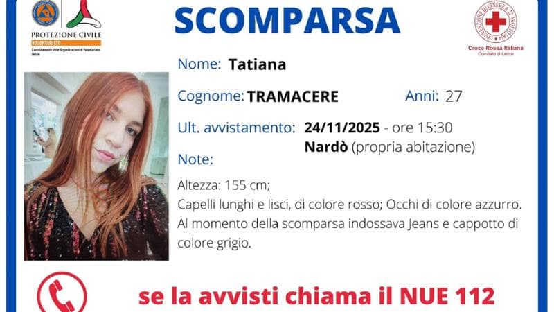 “Tatiana non si allontana mai senza avvisare la famiglia. Per questo – scrive il sindaco di Nardò Pippi Mellone sulla propria pagina social – la preoccupazione cresce di ora in ora. Le ricerche continuano senza sosta. La Prefettura e le forze dell’ordine stanno controllando tutto il territorio. Se l’avete vista o avete informazioni chiamate subito il 112. Anche un piccolo dettaglio può fare la differenza”.