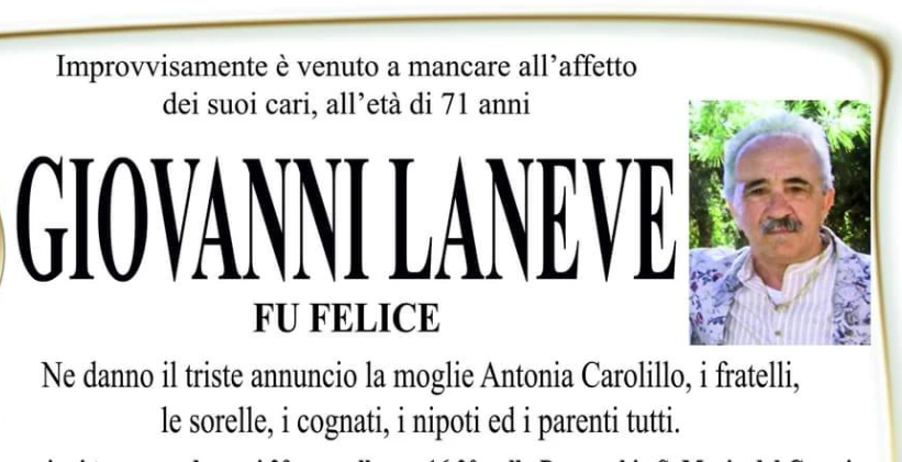 Il personale del Nucleo sommozzatori dei Vigili del fuoco ha recuperato il corpo di Laneve dopo aver individuato l’auto, sollevata poco dopo da un’autogru. Le indagini vanno avanti, ma non è esclusa al momento alcuna ipotesi dagli inquirenti. I funerali si terranno questo pomeriggio nella parrocchia S.Maria del Carmine alle 16.30.
