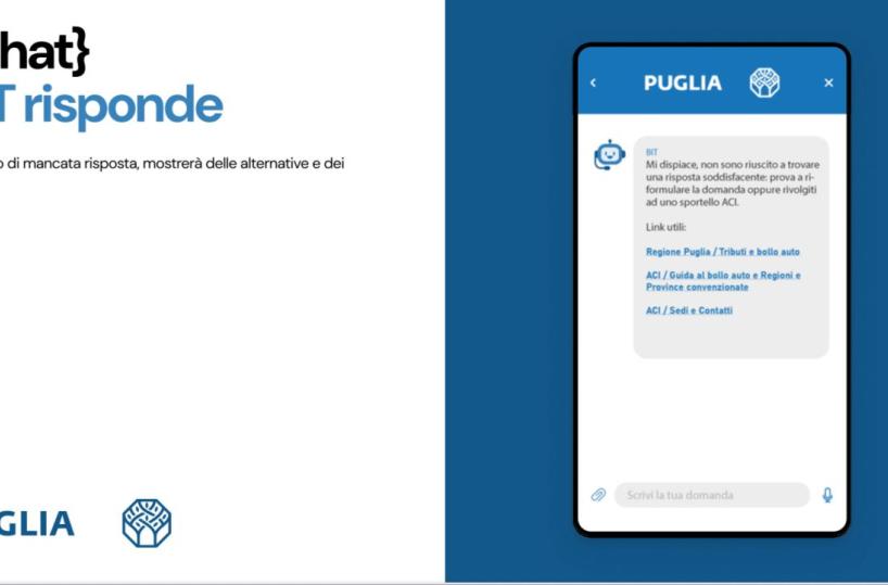 Nasce la prima chatbot con intelligenza artificiale generativa, per la gestione del bollo auto. Con un click i cittadini potranno ottenere chiarimenti e servizi. BIT PUGLIA è già online. Per accedere bisogna digitare www.regione.puglia.it/web/tributi/bollo-auto e poi cliccare sull’icona della chatbot.