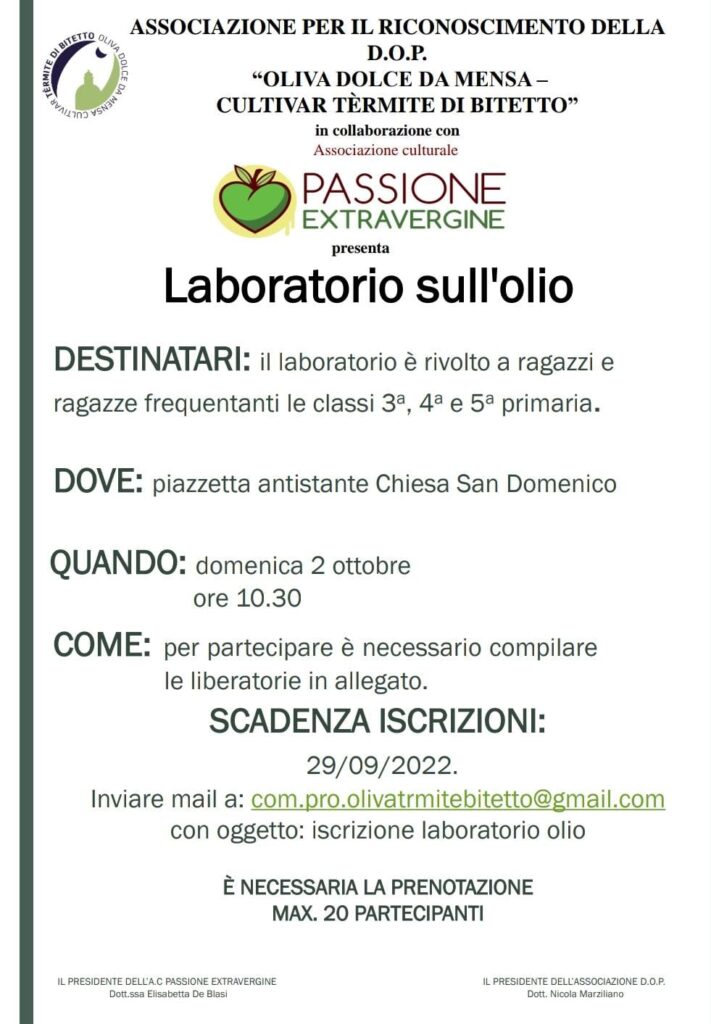 Il Comitato promotore per il riconoscimento della D.O.P. dell’Oliva Baresana – Cultivar Térmite di Bitetto, in collaborazione con l’associazione culturale Passione Extravergine, ha organizzato nella giornata di domenica 2 ottobre, a partire dalle 10.30, un laboratorio sull’olio rivolto a ragazzi e ragazze frequentanti le classi 3°, 4° e 5° della scuola primaria, nella piazzetta antistante la Chiesa San Domenico. L’evento rientra nella XXIX sagra dell’Oliva Dolce Térmite di Bitetto. La scadenza delle iscrizioni è fissata a questa sera. Per partecipare al laboratorio infatti è necessaria la prenotazione e compilare le liberatorie, inviandole all’email [email protected] con oggetto “iscrizione laboratorio olio”.
