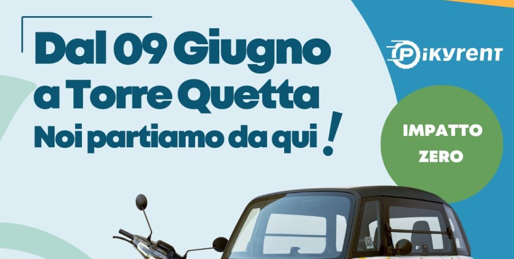 Auto e moto elettriche targate Pikyrent sbarcanoa a Torre Quetta. Sulla spiaggia barese verrà infatti installato un hub per il noleggio dei mezzi della società già attiva su Bari. Ad annunciarlo sono gli stessi gestori di Torre Quetta. “Il compendio demaniale di Torre Quetta sempre più accogliente e sensibile ai temi sociali e ambientali – si legge nel post -. Torre Quetta ha deciso di ospitare in maniera gratuita, un Hub per il noleggio di auto e moto elettriche Full Electric dal 9 giugno con la partnership di Pikyrent. Disponibile una flotta mista di microcar e scooter per studenti, lavoratori pendolari, turisti e in generale a chi ama spostarsi in modo facile e green”.