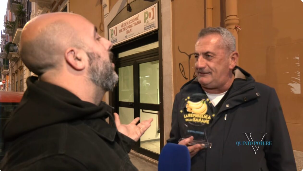 Antonio e Tino hanno consegnato “La Repubblica delle Banane” ad Alberto D’amato, delfino di De Nicolo, ex consigliere comunale e segretario del PD molfettese e a Pino Giulitto, Sindaco di Bitritto e segretario del PD della Terra di Bari. Nel video le reazioni.