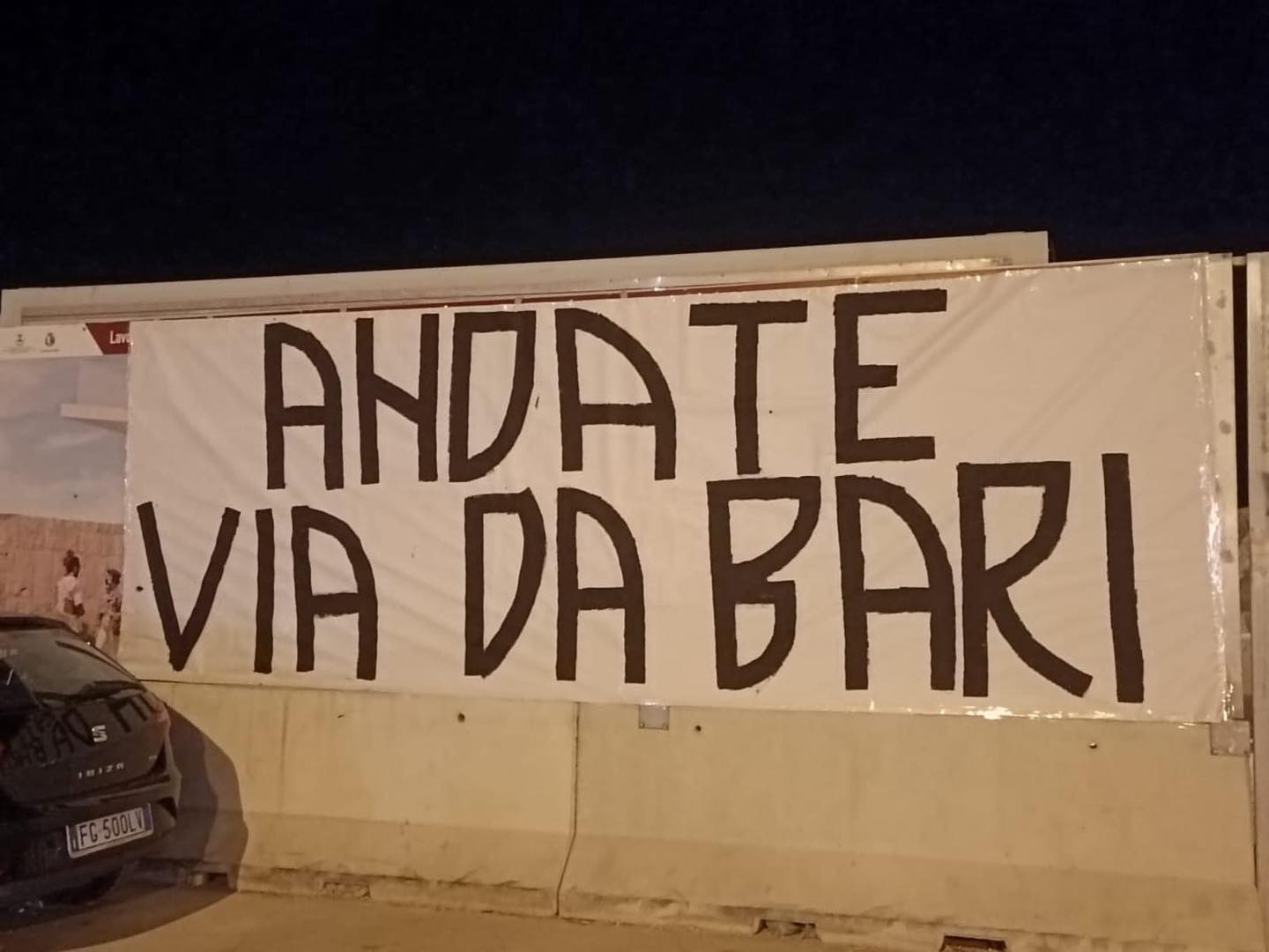 Dopo i diversi striscioni affissi in alcuni punti della città di Bari, la protesta è arrivata nella notte anche a Roma, città sede della Filmauro. Il tutto a poche ore di distanza dalla sfida del San Nicola contro il Lecco.