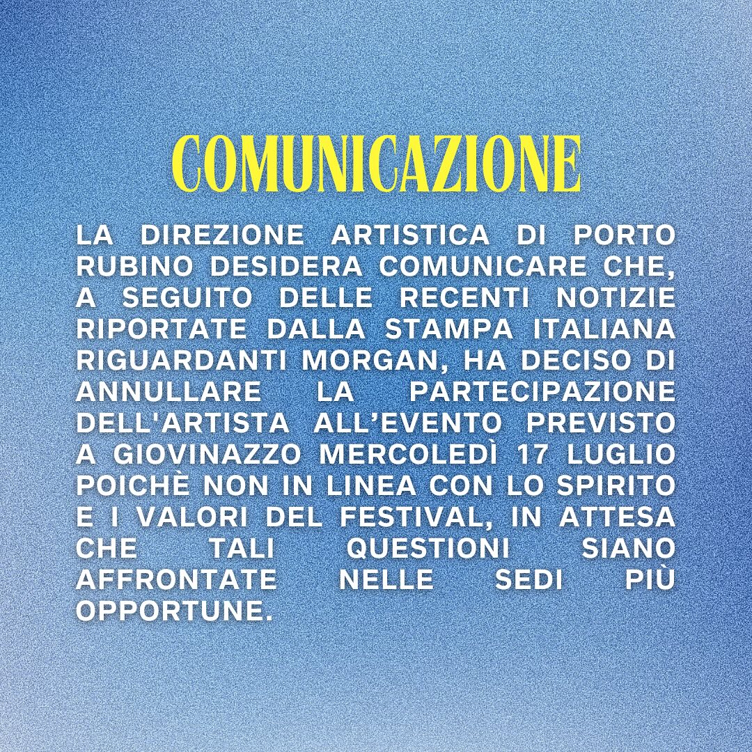 La direzione artistica di Porto Rubino ha deciso di annullare la partecipazione dell’artista all’evento previsto a Giovinazzo mercoledì 17 luglio poichè non in linea con lo spirito e i valori del Festival. Tanti artisti della scena musicale italiana e non solo hanno pubblicamente assunto una dura posizione contro di lui, usando parole ed espressioni fortissime per quanto emerso.