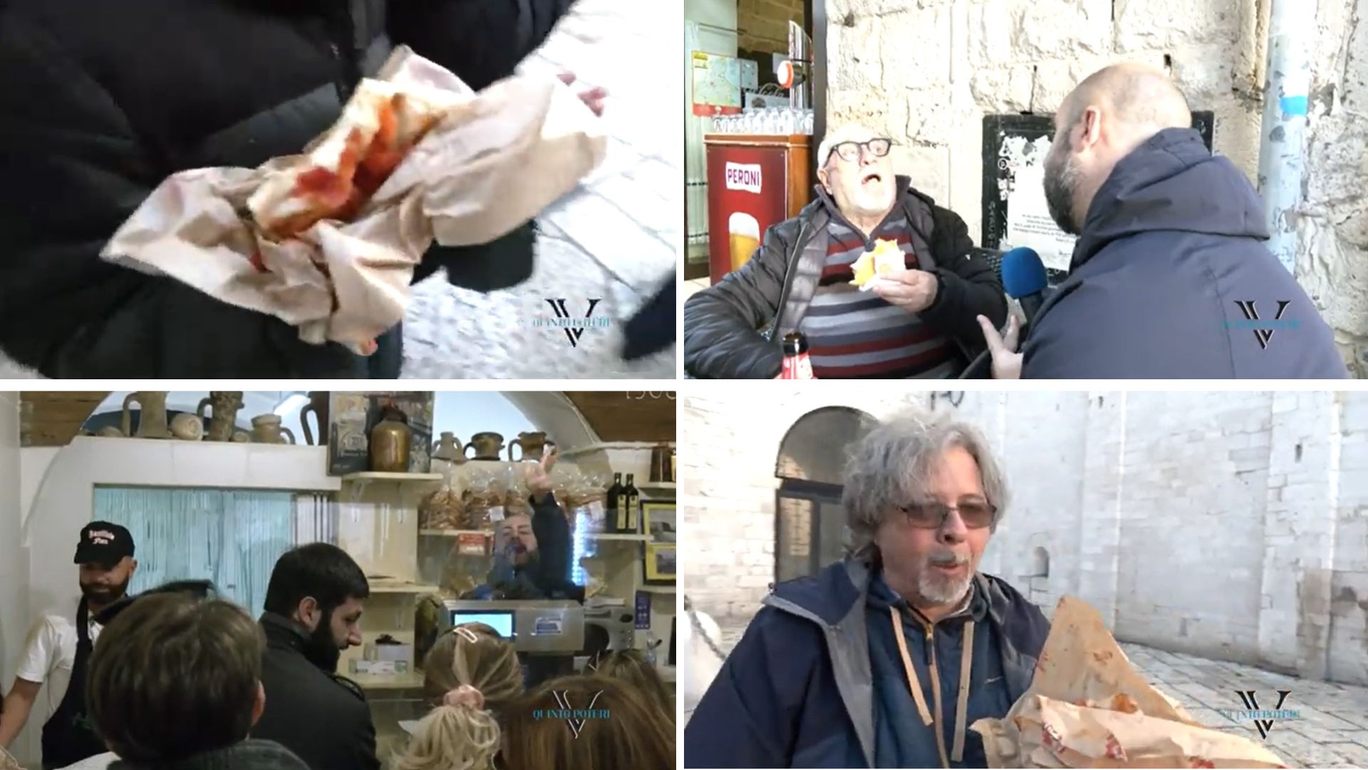 Da Bologna a Bari per un pranzo tipico pugliese, con l’immancabile colazione a base di focaccia e Peroni. Abbiamo incontrato questo simpaticissimo gruppetto tra i vicoli della città vecchia. Un blitz velocissimo di poche ore da parte dei “Magnifici 7”, per poi fare subito ritorno in serata nel capoluogo dell’Emilia-Romagna. Marito e moglie lavorano nel mondo della ristorazione e hanno deciso di portare con sé i loro 5 dipendenti. L’idea è nata proprio ad uno di loro, di origini tarantine. Siamo riusciti a strappare un invito nel ristorante Aleotti di Bologna e anche sette iscrizioni al canale Youtube di Quinto Potere.