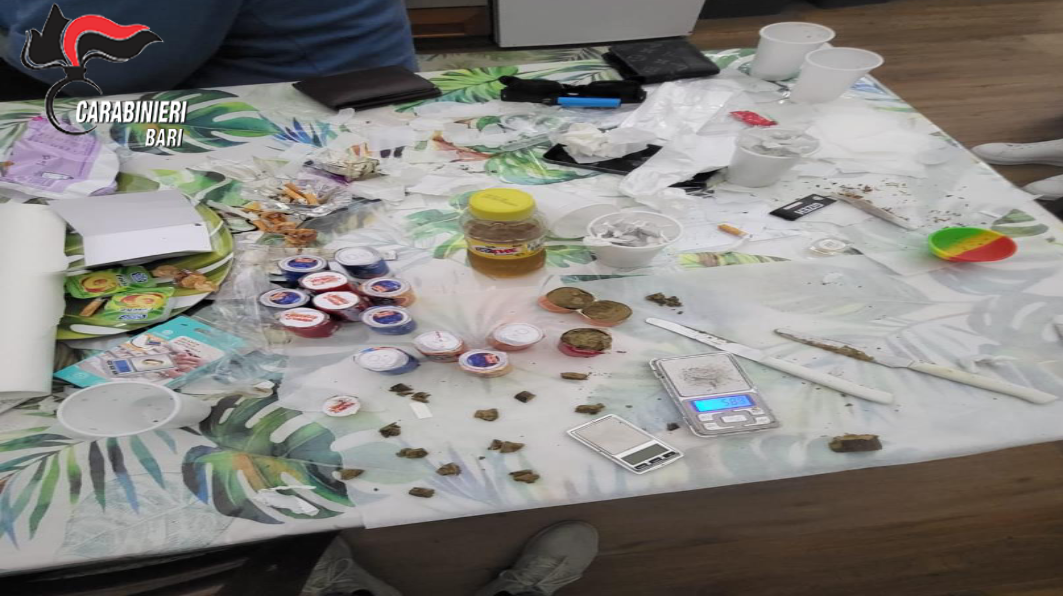 Nei giorni scorsi, i Carabinieri della Tenenza di Mola di Bari e del Nucleo Operativo e Radiomobile, hanno eseguito una perquisizione domiciliare all’interno di una stanza di un B&B del posto, presa in locazione per una notte da uno degli arrestati, dove sono stati sorpresi ed identificati i sette giovani intenti nel confezionamento delle dosi di droga. Al termine delle operazioni dei Carabinieri sono stati rinvenuti 750 grammi di hashish, di cui parte già suddivisi in “dosi” pronte per lo spaccio e 14 “panetti” occultati all’interno di contenitori in carta con il marchio delle lattine di bevande varie. È stato rinvenuto inoltre diverso materiale per il confezionamento, 2 bilancini elettronici di precisione e la somma contante di 475,00 euro.