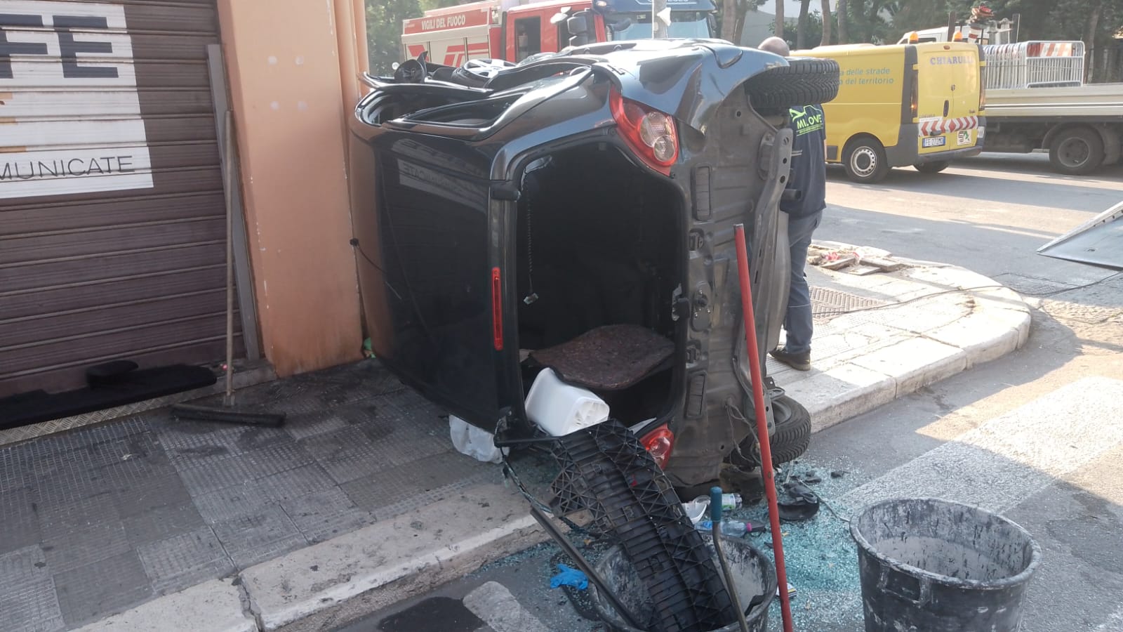 Bari, schianto in via Giulio Petroni: ci sono feriti. Auto finisce contro la saracinesca di un negozio – FOTO
